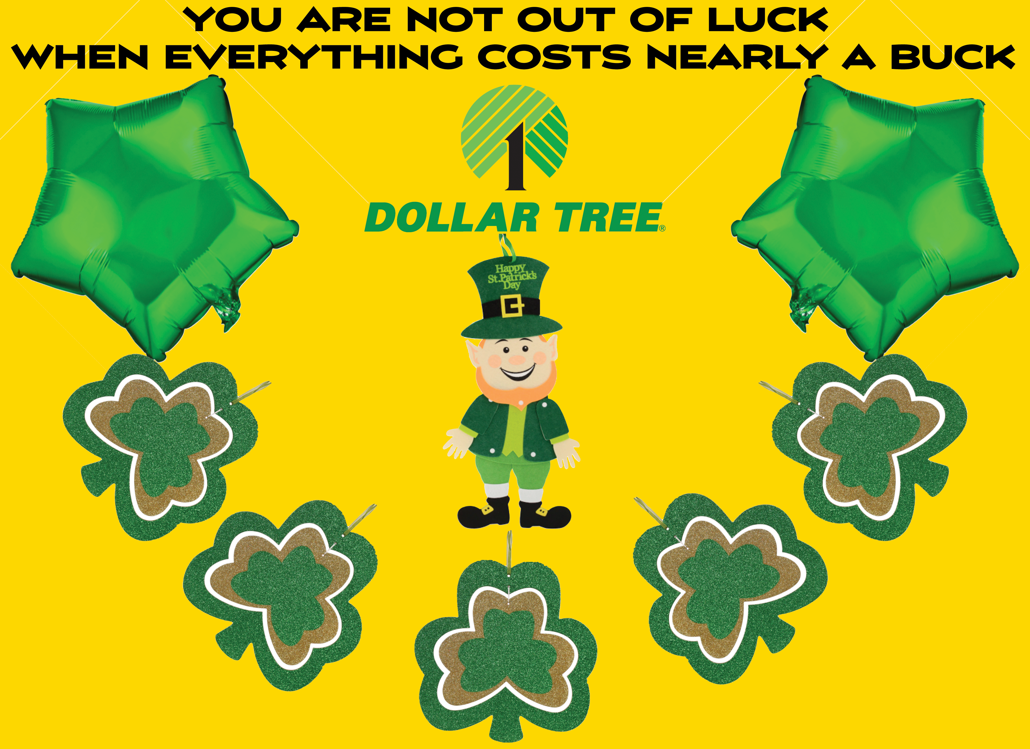 I made a fake advertisement for Dollar Tree with a Saint Patrick's Day theme. I arranged images of Dollar Tree's Saint Patrick's Day products into the shape of a smile, and across the top I put a holiday poem, acting as a hat for it. The poem relates to how inexpensive products are at Dollar Tree, as everything is "nearly a buck".