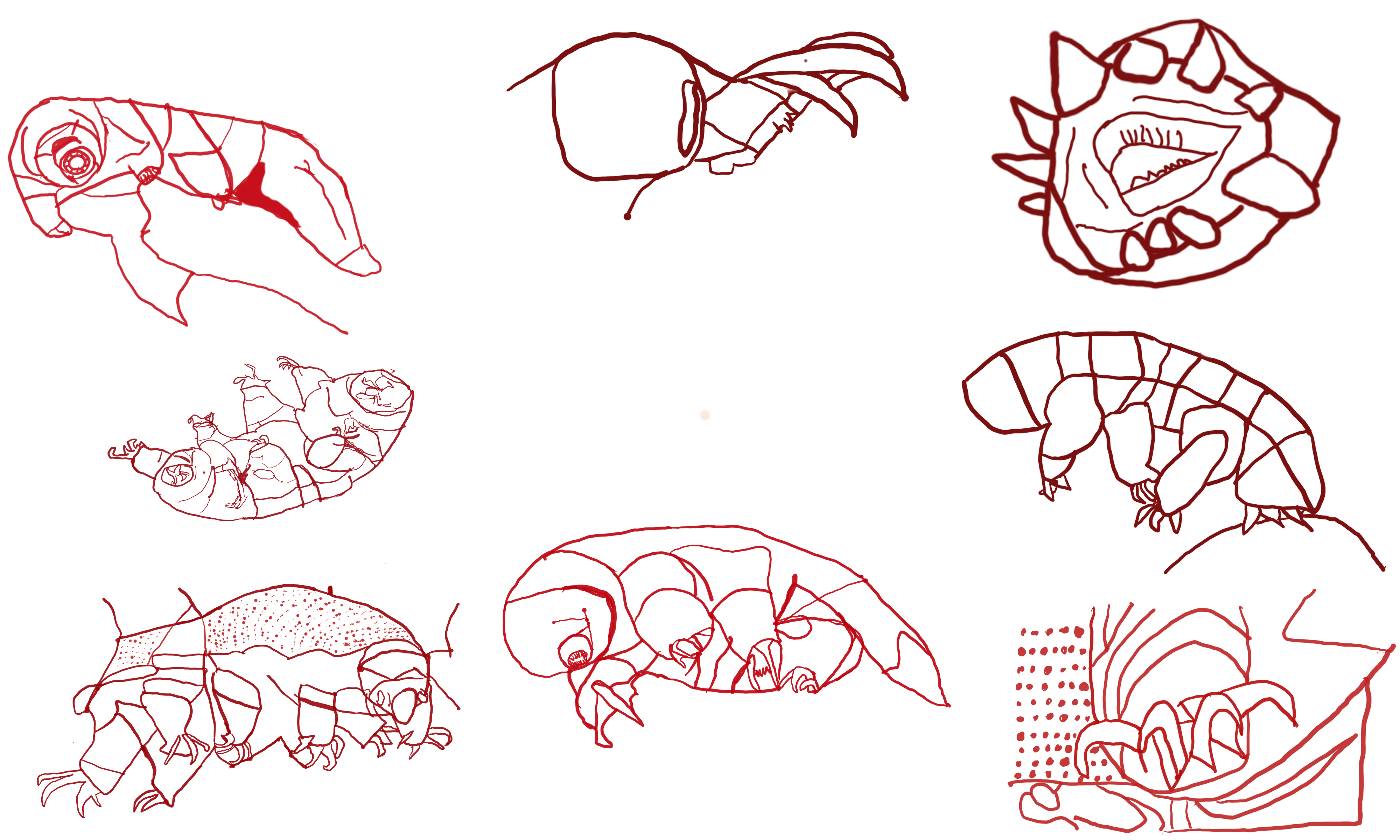 This is my attempt at drawing a unique looking creature known as a tardigrade, or water-bear. I tried to focus on different aspects of the tardigrade such as the claw and the head to express different features of the tardigrade.