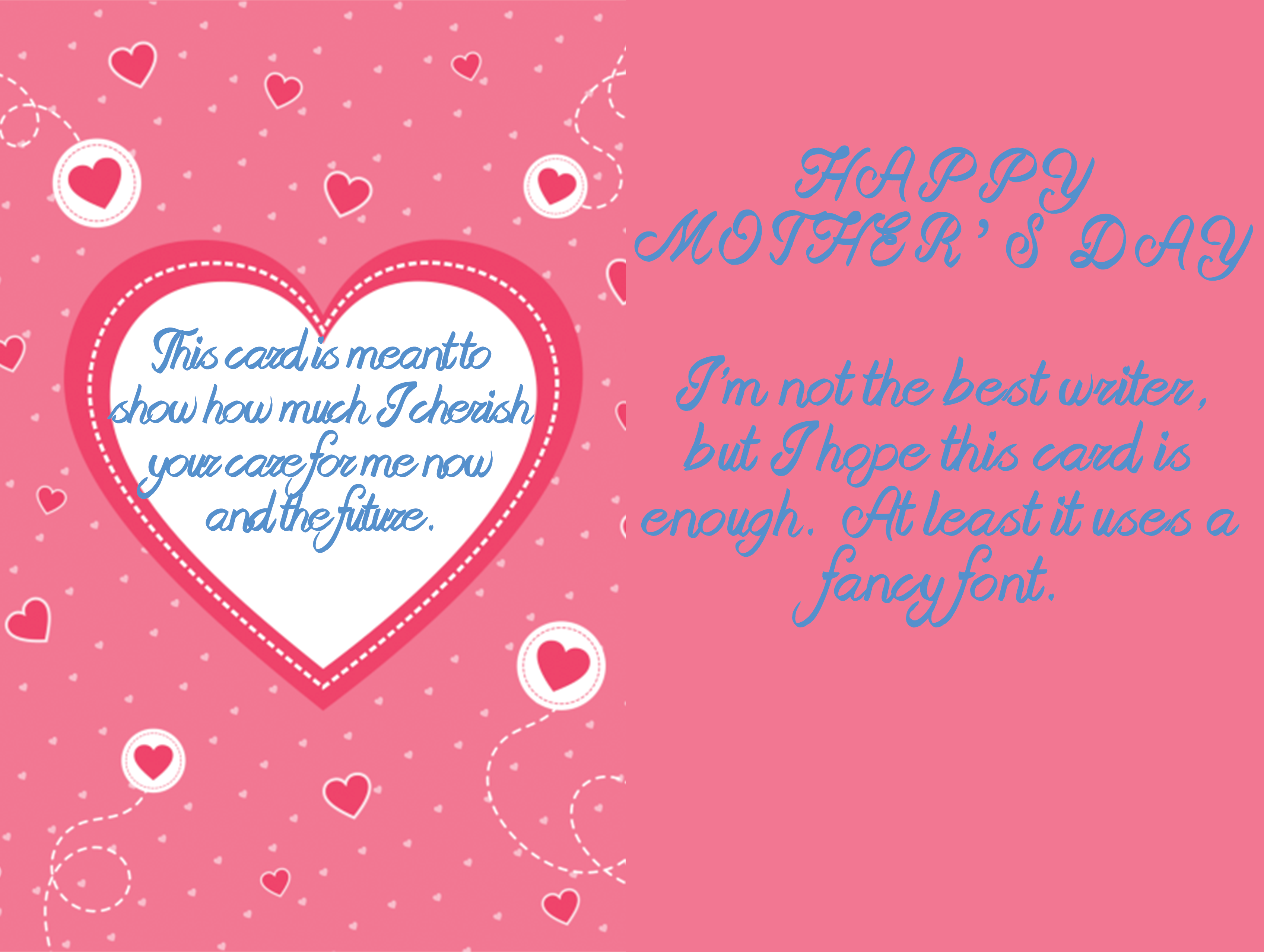 This assignment required me to make five different greeting cards, each being for a separate occassion. Based on the holidays around the time I made the cards, the cards are directly for Arbor Day, Mother's Day, Birthday, Wedding Anniversary, and wishing for someone to get well. The left side of the graphic displays the cover of the card, while the right side of the graphic displays a short poem that would be inside of the card.
